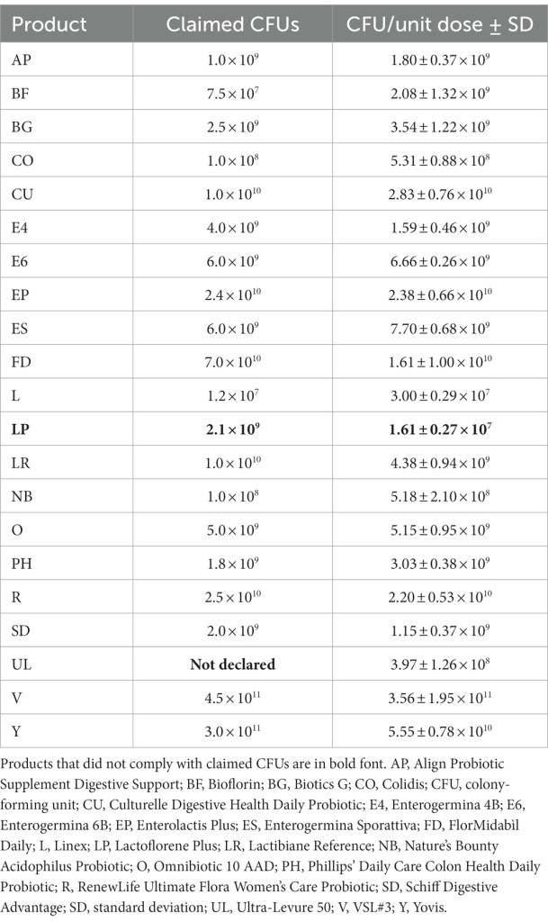 A study reported in 2023 also analysed the microbial content and survivability of 21 commercial probiotic products available worldwide. The results regarding claimed CFUs (colony forming units) versus actual from the study are below: