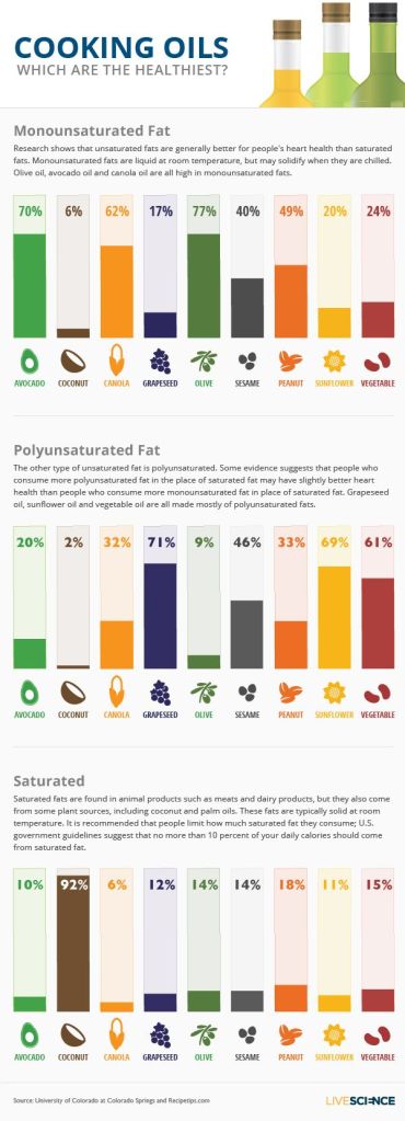 The below infographic from an article in Live Science, shows the different types of fat content in a variety of cooking oils: