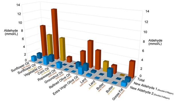 In the graph above, orange represents the amount of toxic aldehydes found in testing of oils with food and in the lab without food (in yellow).