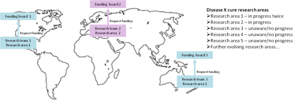 - potential global or even national replication of work & wasted funding. For example, in the diagram Research area 1 is shown as being worked on twice (far left and bottom right)